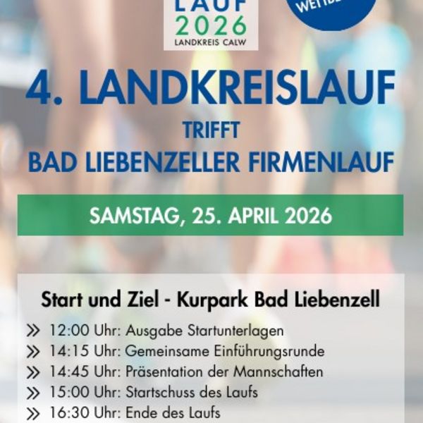 14:00 Uhr Start 4 Team-Staffel-Wettbewerb 4. Landkreislauf trifft auf Bad Liebenzeller Firmenlauf.