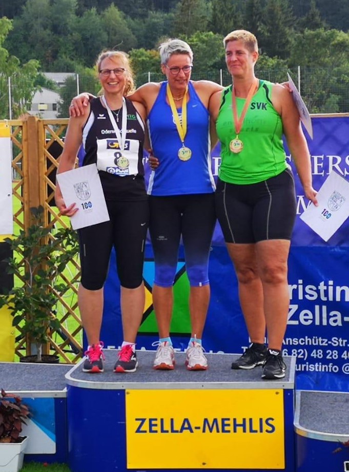 Natascha Wolf (DJK Villingen) kam 14 Monate nach ihrem Achillessehnenriss auf 3.340 Punkte und setzte sich in einem spannenden Vierkampf am Ende in der W40 durch. Dabei waren bei Beginn die Aussichten auf eine Medaille nicht allzu groß, denn die drei zurzeit besten Vielseitigkeitswerfer dieser Altersklasse waren ebenfalls am Start. Mit den Jahresbestleistungen im Hammerwerfen bei 41,41 Meter, im Kugelstoßen mit 9,29 Meter, im Speerwerfen mit 26,98 Meter sowie im Gewichtwerfen mit 12,49 Meter lag die Villingerin aber in Lauerstellung auf Gold. Mit starken 33,48 Meter im Diskuswerfen konnte sie dann aber endgültig den Sieg erringen und mit 3.340 Punkten auch auf ein gutes Punktekonto kommen. Auch über die die Bronzemedaille durfte sich eine Athletin aus Baden-Württemberg freuen: 3.253 Punkte erzielte Birgit Keller von der LG Sigmaringen.