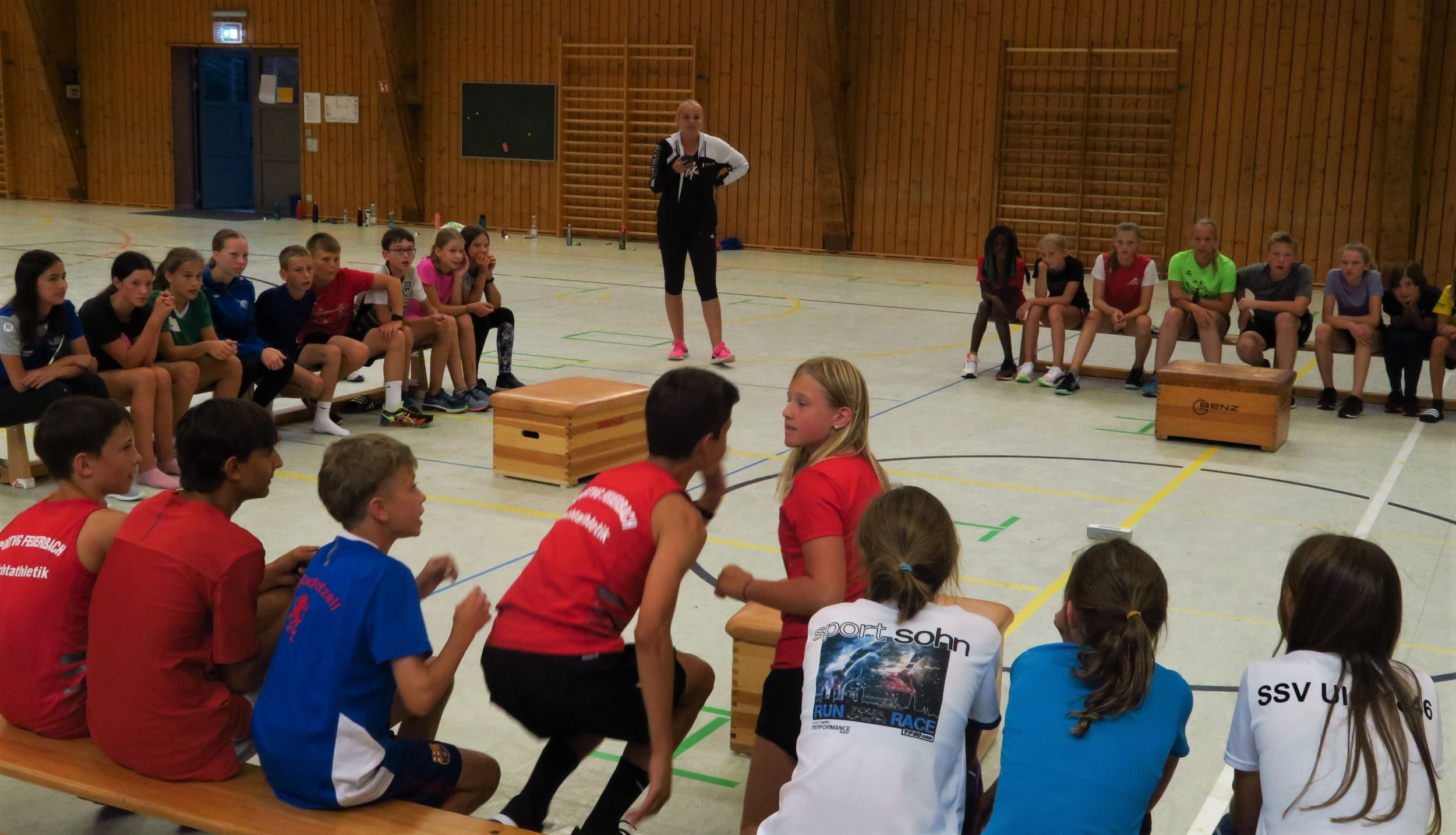 Nach der Begrüßung durch die Camp-Leiter Volker Zahn bzw. Christian Hummel konnte es im Stationenbetrieb losgehen, der in fünf Leichtathletik-Einheiten fast den ganzen Disziplin-Kanon abdeckte. Kennenlernspiele sorgten dafür, dass die Gruppen mehr Wissen über ihre Mitglieder anhäuften. Eine besondere Überraschung gab es für die Albstädter Gruppe: WM-Teilnehmerin Elisa Lechleitner – im Vorjahr noch als Betreuerin dabei – stattete dem Camp einen Besuch ab, gab Einblicke ins WM-Unternehmen und im Stadion dann auch massig Autogramme.