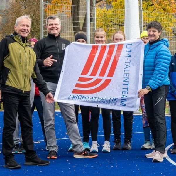 Im Rahmen des Trainings des U14-Talentteams hat der Vertreter des Badischen Leichtathletik-Verbands Harald Schaich (Mitglied des BLV-Ausschusses Nachwuchsleistungssport und Sportwart BLV-Kreis Region Freiburg) der örtlichen U14-Teamleiterin Gabriele Engelhardt das Label „U14-Talentteam Leichtathletik Baden-Württemberg“ überreicht. Während die möglichen Medaillengewinnerinnen und -gewinner von morgen trainieren, schmückt nun ein großes Banner die Trainingsstätte des U14-Talentteams des BLV-Kreises Region Freiburg. Wer sich mit leistungssportlichen Karrieren beschäftigt weiß, dass es gerade im Übergang vom Kindesalter zum Teenie auf Zusammenhalt, Durchhaltevermögen und Freunde, die den Traum vom großen sportlichen Erfolg teilen, ankommt. Wenn das Training dann noch von engagierten Trainerinnen und Trainern geleitet wird, können aus diesen Talenten die Medaillengewinner von morgen werden.